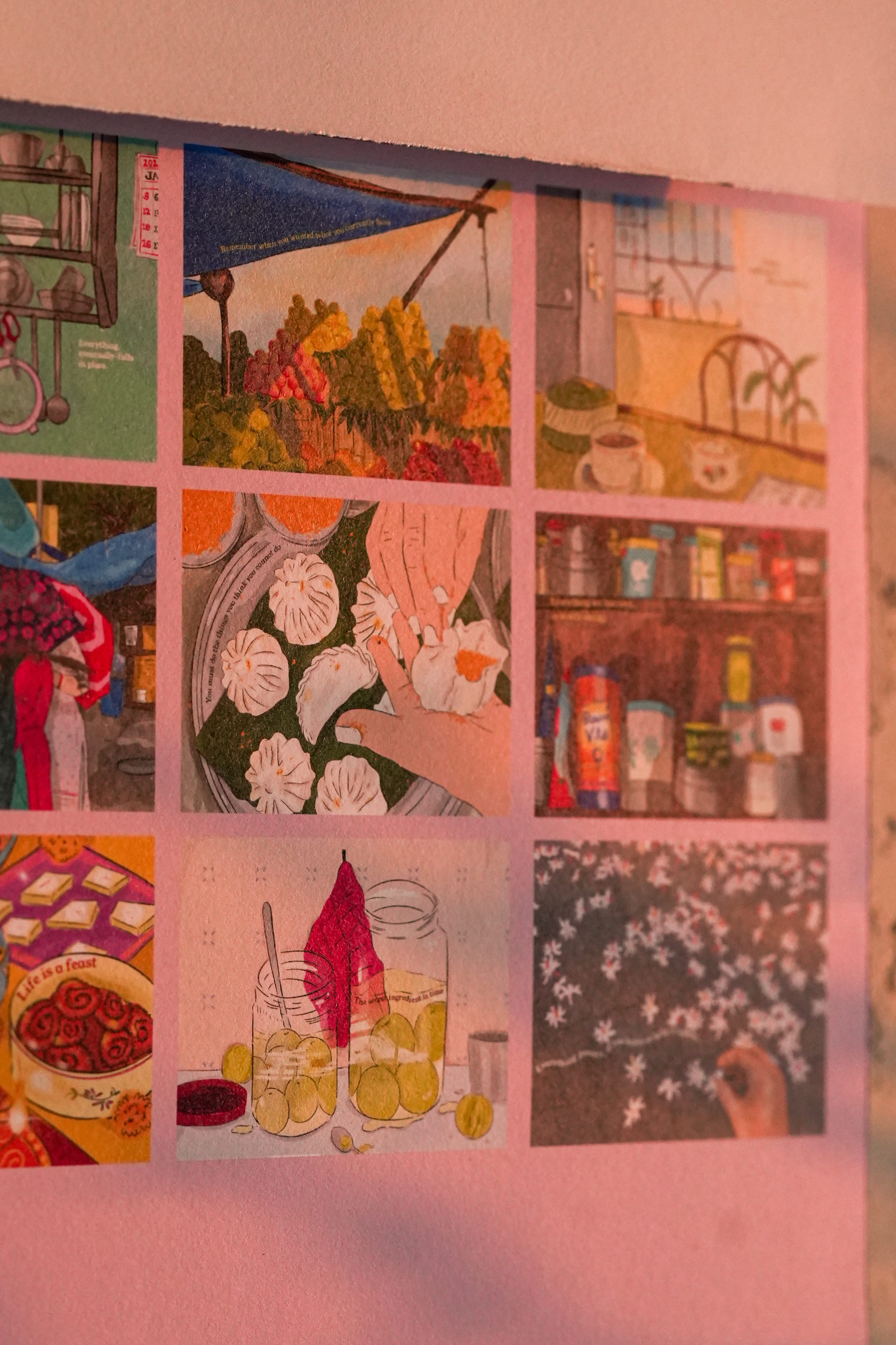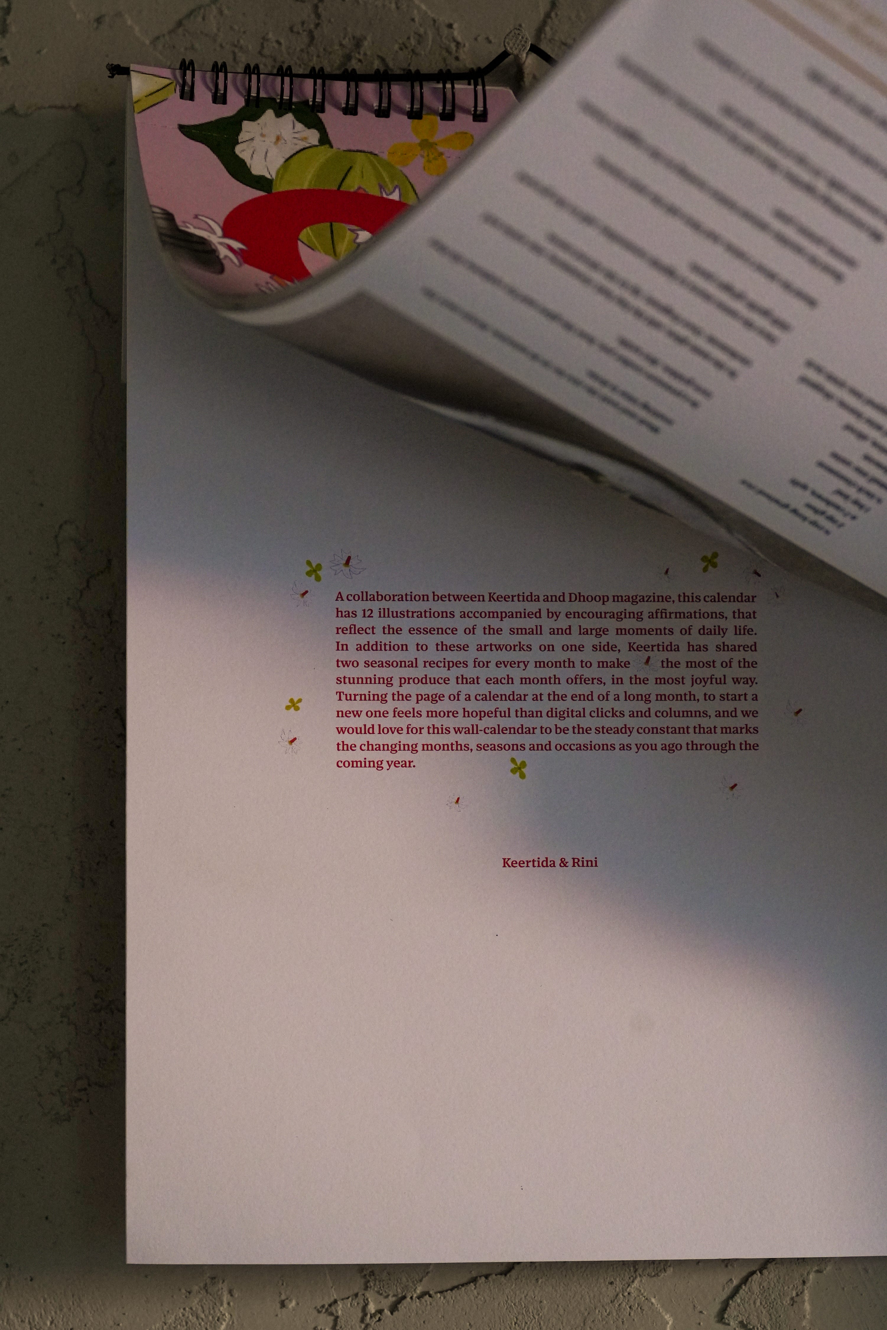 We partnered with Keertida Phadke on a 2025 calendar, which is not only peppered with beautiful illustrations for each month of the year but also has some affirmations that will make you pause to reflect on the small and big moments of life. All of these illustrations are put together using real photos from our galleries—photos of moments we look back on and cherish. A jar of amla, the fallen parijat flowers, the act of diligently making a modak, and the stacks of mismatched dabbas in every household.